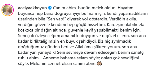 Açelya Akkoyun’un paylaşımı kısa sürede büyük üzüntü yarattı ve birçok takipçisinden taziye mesajı geldi.