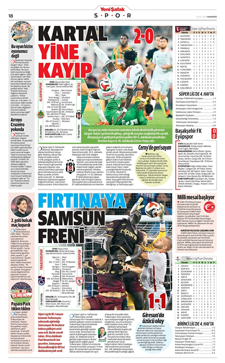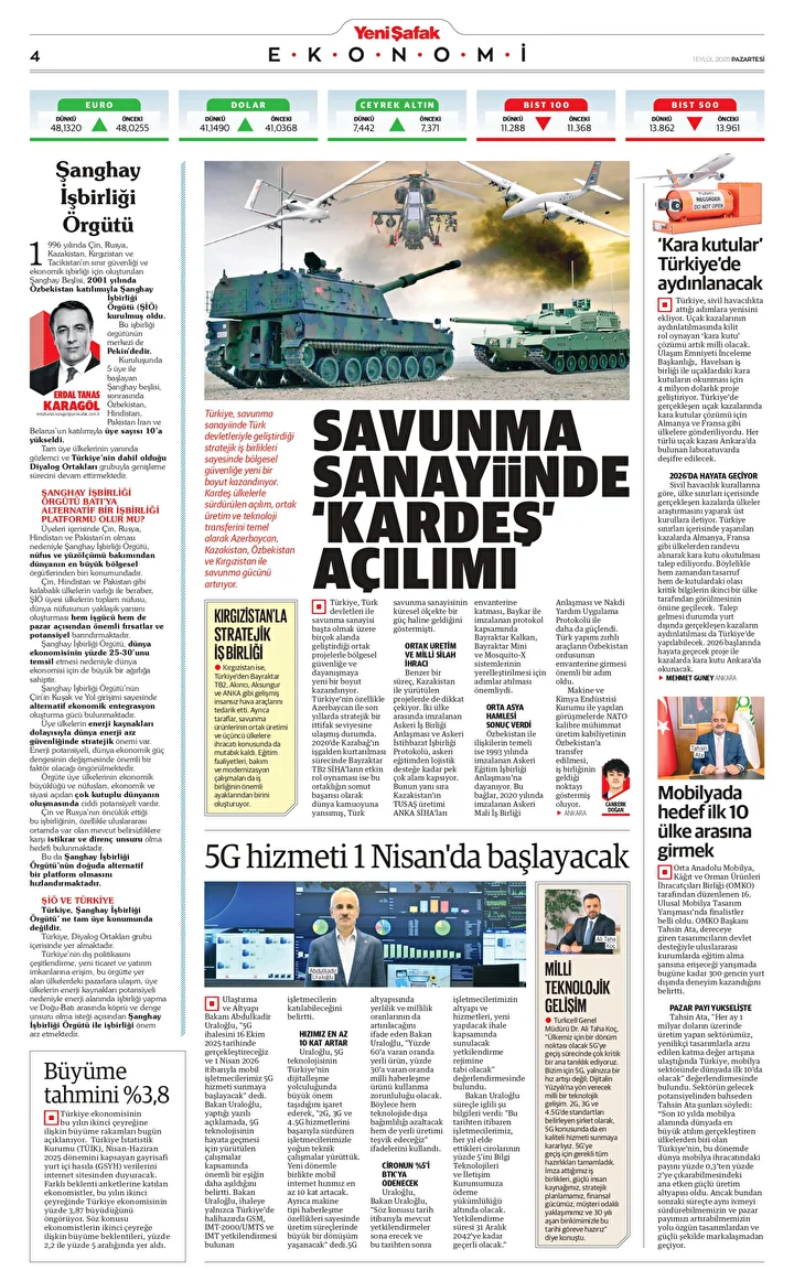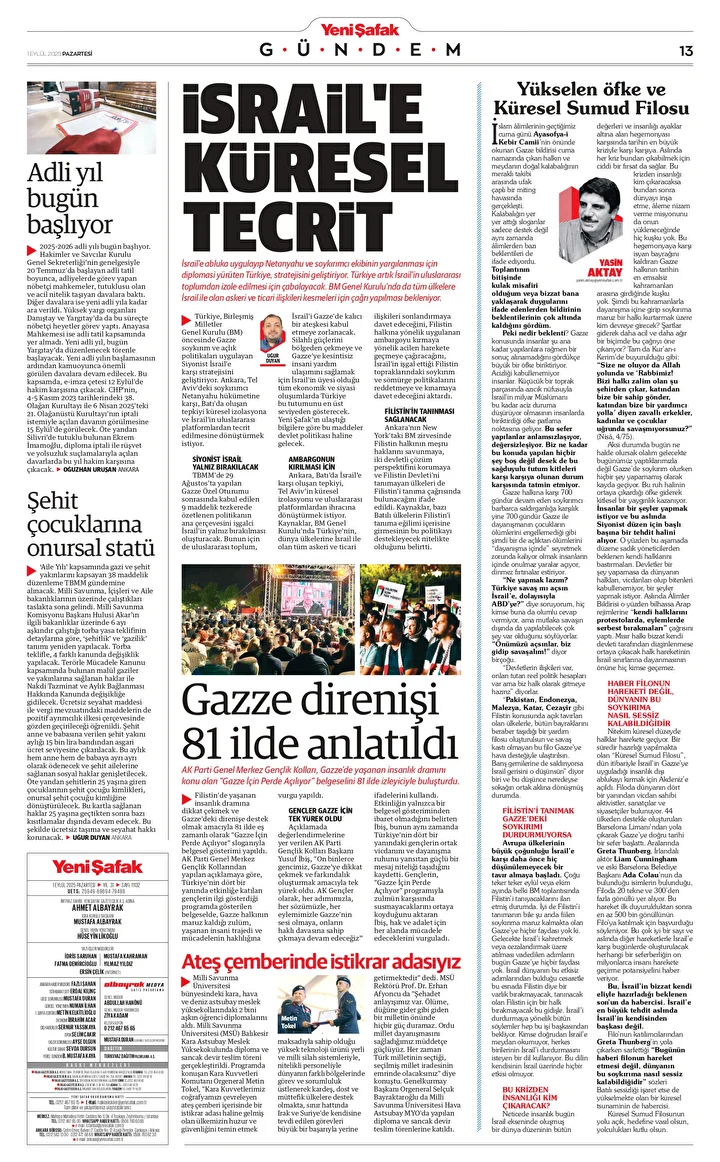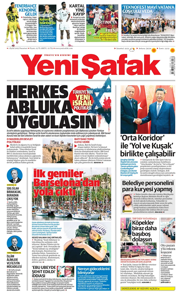 Yeni Şafak Gazetesi’nin 01 Eylül 2025 tarihli birinci sayfasında yer alan manşet ve haberler…